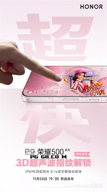 全新荣耀500系列将于11月24日亮相,其中的荣耀500 Pro因加入「3D超声波指纹」技术而备受关注。此功能主打湿手解锁0.1秒完成,让玩家在进行PG电子汉堡大升级试玩时不再因解锁延迟被打断,整体操作流畅感大幅提升。